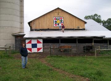 | Flying Geese Barn Quilt Block being installed onto a customer's barn & Sho Fly Block painted on Barn door. |